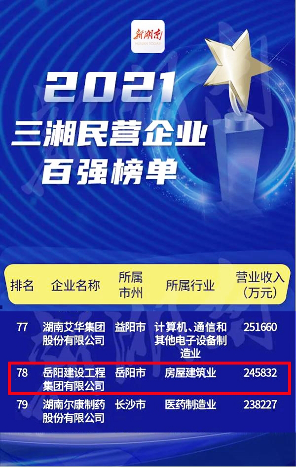 此次百強榜單是以民營企業(yè)2020年營業(yè)收入總額作為排序依據(jù)。2020年,三湘民營企業(yè)百強營業(yè)收入總額合計為8701.34億元,比上年提高624.39億元,增長幅度為7.73%。岳陽建設(shè)工程集團有限公司以24.5832億元位居第78位。