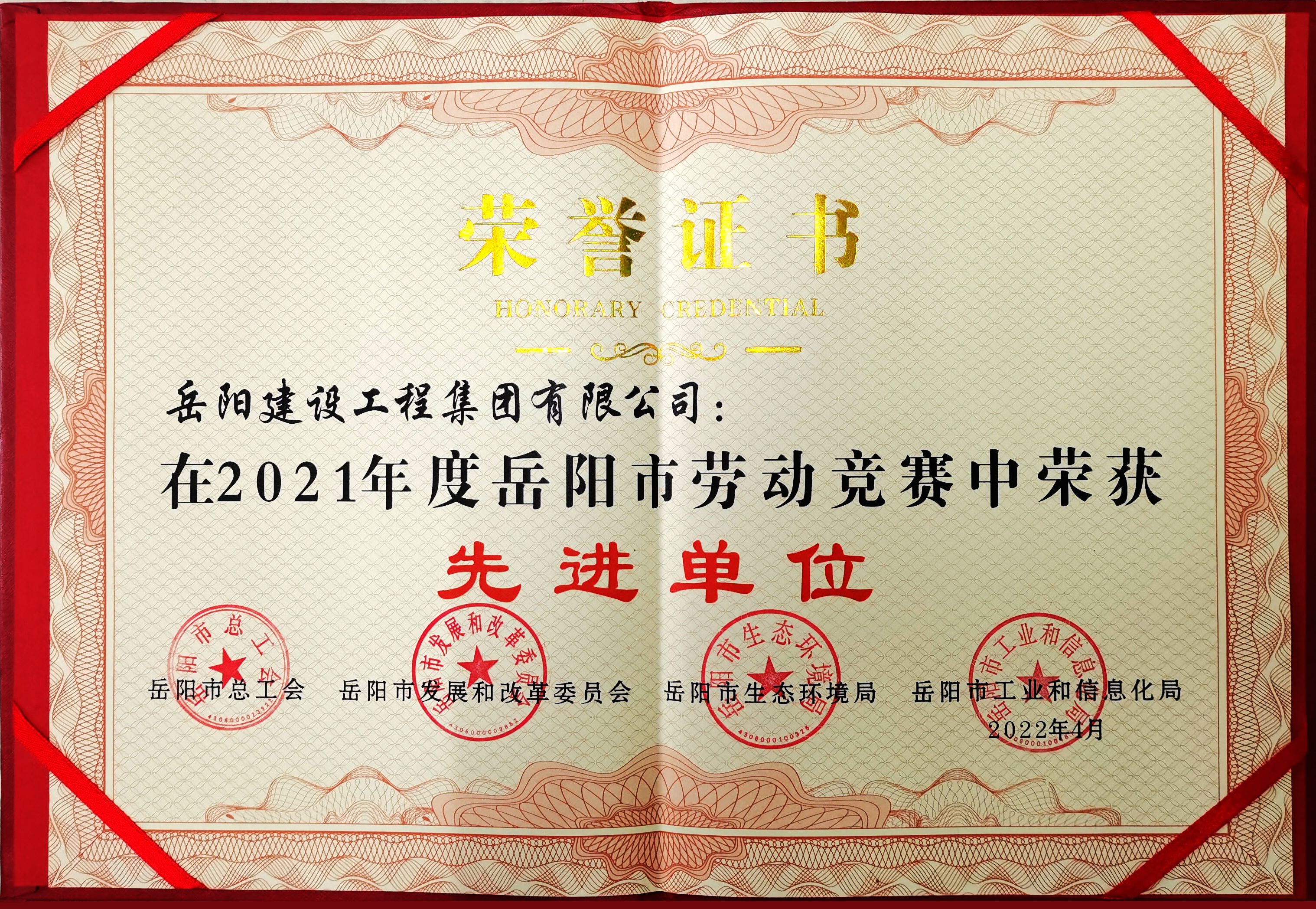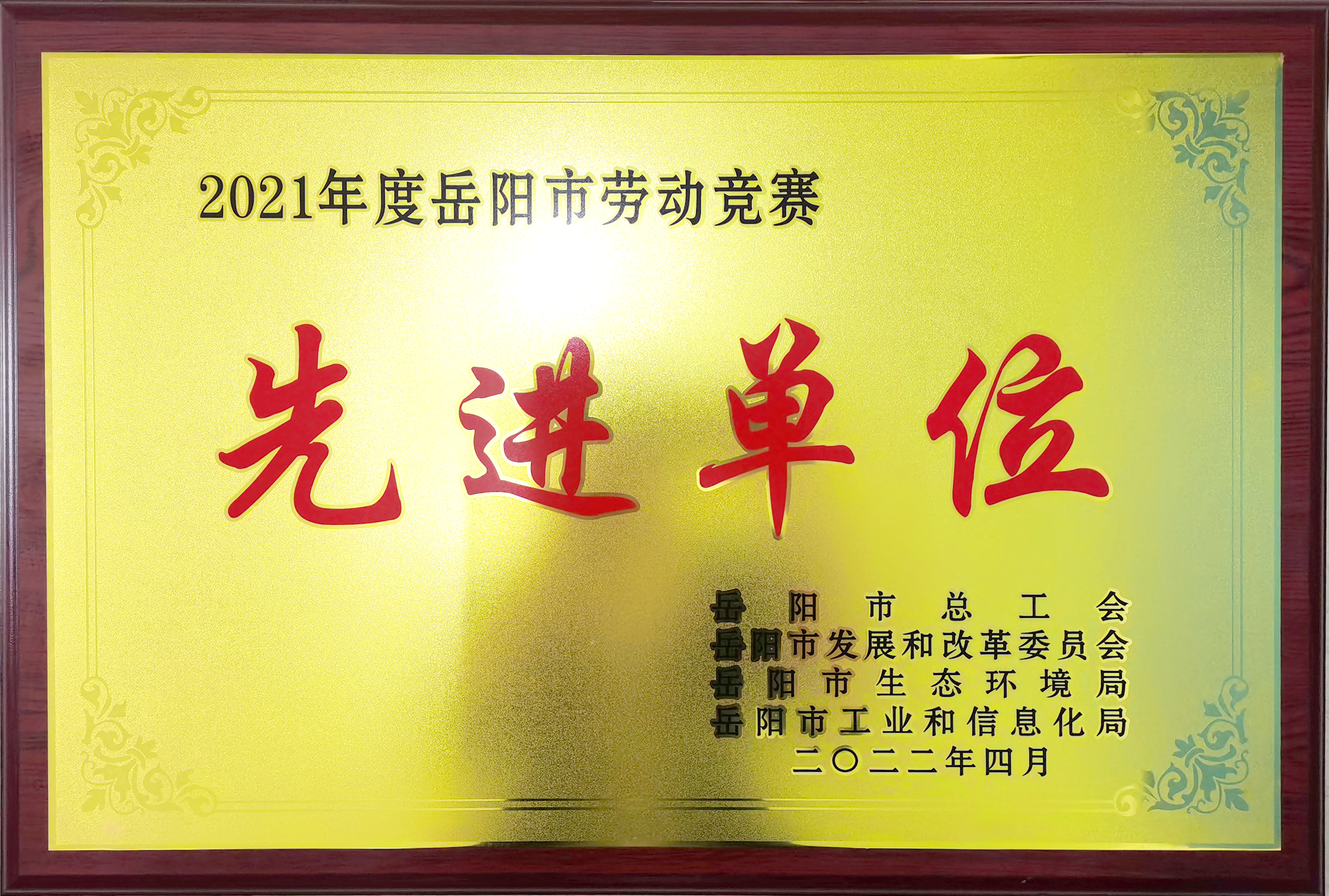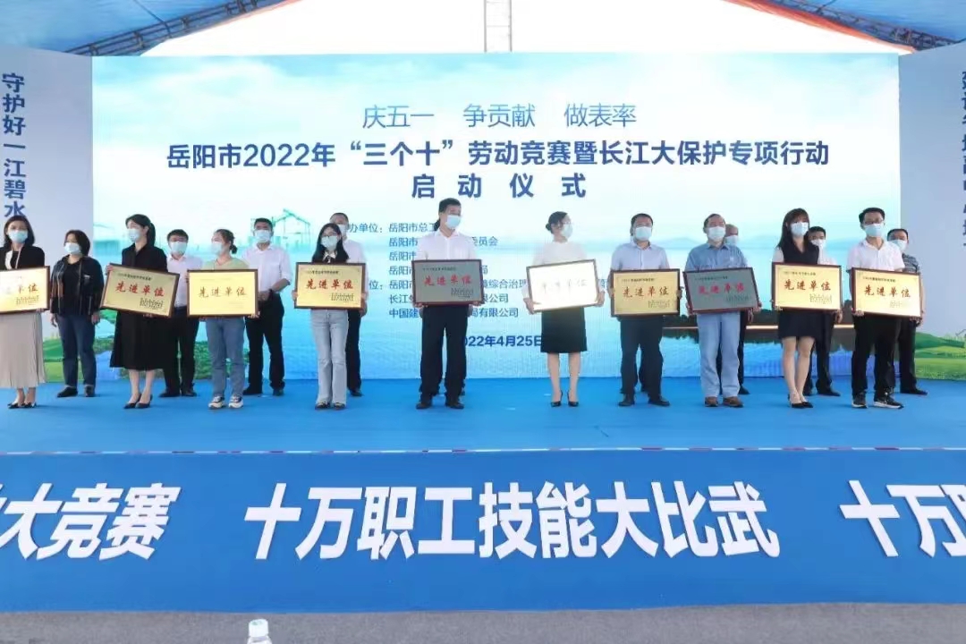 4月25日上午,岳陽(yáng)市2022年“三個(gè)十”勞動(dòng)競(jìng)賽暨長(zhǎng)江大保護(hù)專項(xiàng)行動(dòng)啟動(dòng)儀式舉行。市政府副市長(zhǎng)李美云作動(dòng)員講話,市八屆人大常委會(huì)黨組副書記、副主任、市總工會(huì)主席彭先政主持。儀式上公布了一批勞動(dòng)競(jìng)賽先進(jìn)單位、先進(jìn)班組、先進(jìn)個(gè)人,我公司榮獲“2021年度岳陽(yáng)市勞動(dòng)競(jìng)賽先進(jìn)單位”稱號(hào)。