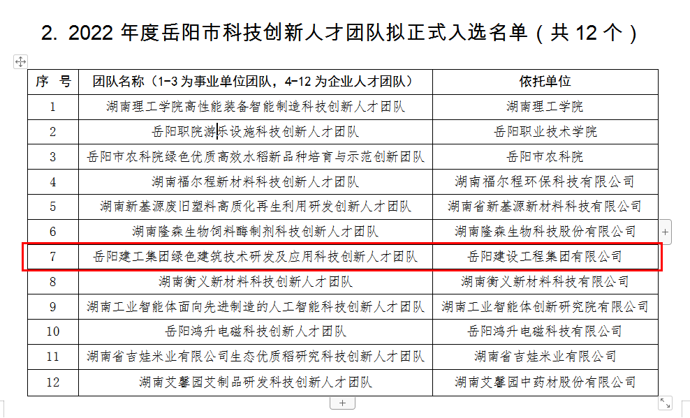 12月19日,2022年度岳陽市科技創(chuàng)新人才團(tuán)隊(duì)擬正式入選名單公布,岳陽建工集團(tuán)由總工程師周一波牽頭的“綠色建筑技術(shù)研發(fā)應(yīng)用科技創(chuàng)新人才團(tuán)隊(duì)”入選。